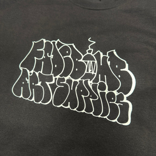 Black tee with stickers. Throwup by ADER, atm